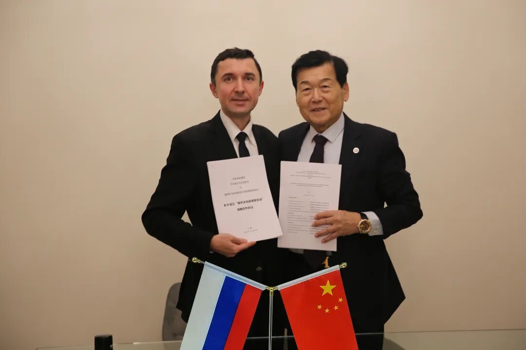陈泉州先生与俄罗斯金砖国家联盟委员会副主席、金砖国家智力游戏国际联合会主席萨沃伊·亚历山大·根纳季耶维奇共同签署成立“俄中文化体育联合会”协议